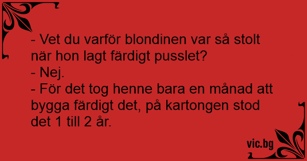Blondinen till sin väninna: - Vet du hur länge det tog för mig att sätta upp det här pusslet? - Ingen aning. - 3 timmar! - 3 timmar? - Ja! Men på kartongen står det 3-5 år...
