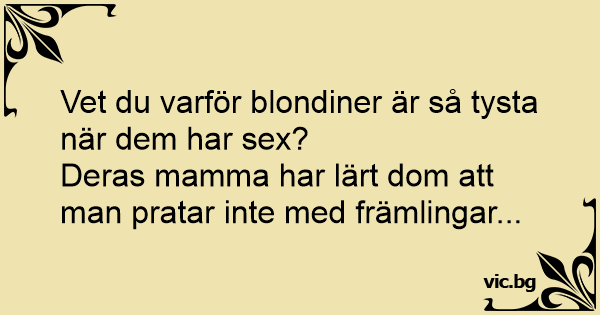 Varför säger inte blondinen något medan hon har sex? Hennes mamma sa åt henne att inte prata med främlingar Hennes mamma sa åt henne att inte prata med munnen full