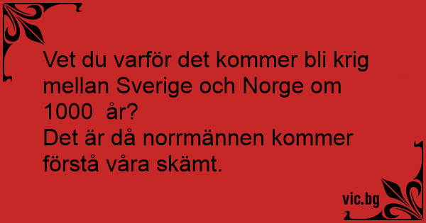 - Vet du varför det blir krig mellan Norge och Sverige om 1000 år? - ???? - För att då förstår dom våra skämt.