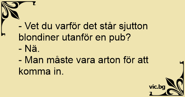 - Det stod sjutton blondiner utanför en pub. Vet du vad de väntade på? - Nej. - Den sista. Man måste vara arton för att få komma in.