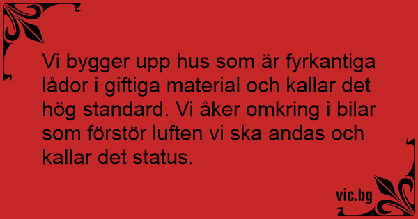 Vi bygger upp hus som är fyrkantiga lådor i giftiga material och kallar det hög standard. Vi åker omkring i bilar som förstör luften vi ska andas och kallar det status.