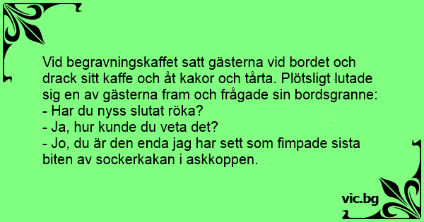 Vid begravningskaffet satt gästerna vid bordet och drack sitt kaffe och åt kakor och tårta. Plötsligt lutade sig en av gästerna fram och frågade sin bordsgranne: