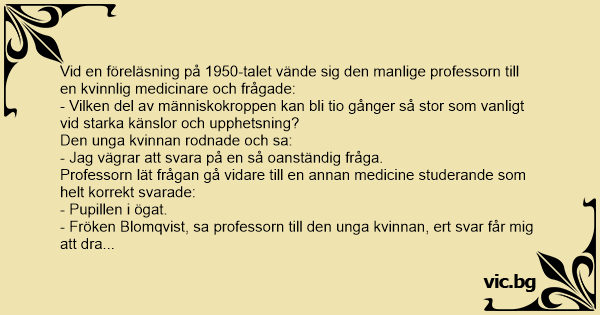 - Fröken Blomqvist, sa professorn till den unga kvinnan, ert svar får mig att dra tre slutsatser. För det första: ni har inte läst på dagens avsnitt. För det andra: ni har snuskig fantasi. Och för det tredje: ert äktenskap kommer att bli en stor besvikelse för er...