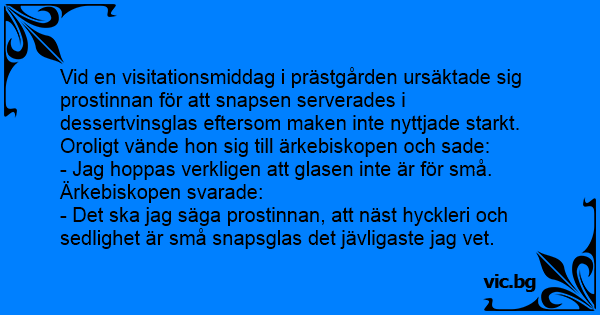 Vid en visitationsmiddag i prästgården ursäktade sig prostinnan för att snapsen serverades i dessertvinsglas eftersom maken inte nyttjade starkt.