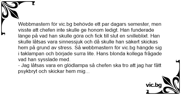 Webbmastern för vic.bg behövde ett par dagars semester, men visste att chefen inte skulle ge honom ledigt. Han funderade länge på vad han skulle göra och fiск till sluт en snilleblixt. Han skulle låtsas vara sinnessjuk och då skulle han säkert skickas hem på grund av stress. Så webbmastern för vic.bg hängde sig i taklampan och började surra lite. Hans blonda kollega frågade vad han sysslade med.
