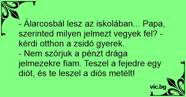 - Álarcosbál lesz az iskolában... Papa, szerinted milyen jelmezt vegyek fel? - kérdi otthon a zsidó gyerek.