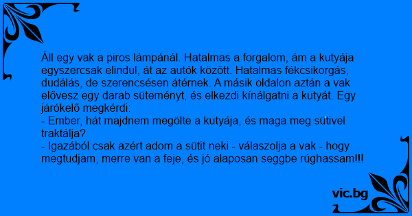 Áll egy vak a piros lámpánál. Hatalmas a forgalom, ám a kutyája egyszercsak elindul, át az autók között. Hatalmas fékcsikorgás, dudálás, de szerencsésen átérnek. A másik oldalon aztán a vak elővesz egy darab süteményt, és elkezdi kínálgatni a kutyát. Egy járókelő megkérdi: