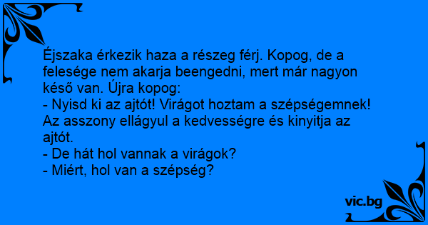Éjszaka érkezik haza a részeg férj. Kopog, de a felesége nem akarja beengedni, mert már nagyon késő van. Újra kopog: