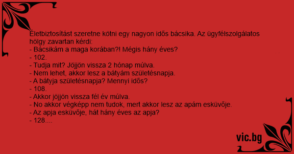 Életbiztosítást szeretne kötni egy nagyon idős bácsika. Az ügyfélszolgálatos hölgy zavartan kérdi: