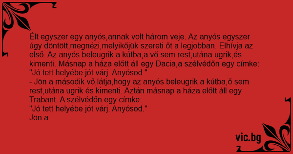 Élt egyszer egy anyós,annak volt három veje. Az anyós egyszer úgy döntött,megnézi,melyikőjük szereti őt a legjobban. Elhívja az első. Az anyós beleugrik a kútba,a vő sem rest,utána ugrik,és kimenti. Másnap a háza előtt áll egy Dacia,a szélvédőn egy címke: