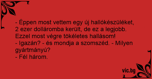 - Képzeld, új hallókészüléket kaptam! - Mennyibe került? - Szerdán, fél három felé.