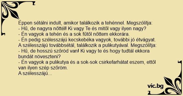 Éppen sétálni indult, amikor találkozik a tehénnel. Megszólítja: