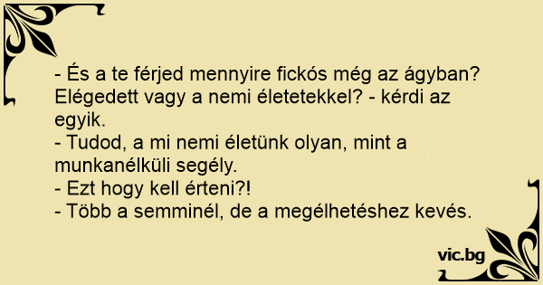 - És a te férjed mennyire fickós még az ágyban? Elégedett vagy a nemi életetekkel? - kérdi az egyik.