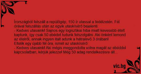 - Kedves utasaink! Sajnos egy logisztikai hiba miatt kevesebb ételt kaptunk, így csak 50 ebédet tudunk felszolgálni. Aki önként lemond az ételről, annak ingyen italt adunk a hátralevő 3 órában!