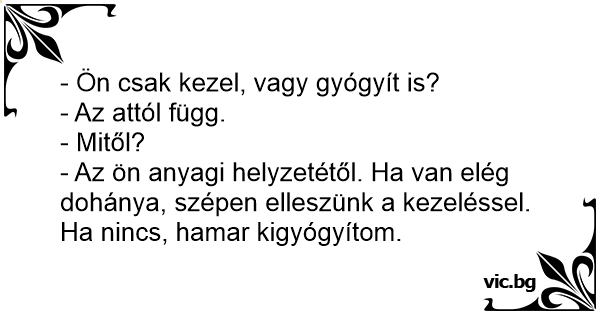 - Az ön anyagi helyzetétől. Ha van elég dohánya, szépen elleszünk a kezeléssel. Ha nincs, hamar kigyógyítom.