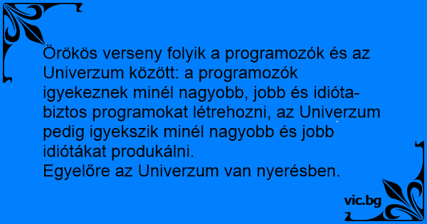 Örökös verseny folyik a programozók és az Univerzum között: a programozók igyekeznek minél nagyobb, jobb és idióta-biztos programokat létrehozni, az Univerzum pedig igyekszik minél nagyobb és jobb idiótákat produkálni.