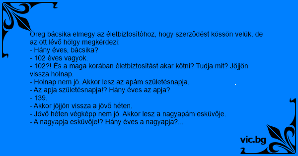 Öreg bácsika elmegy az életbiztosítóhoz, hogy szerződést kössön velük, de az ott lévő hölgy megkérdezi: