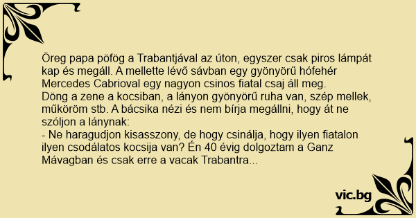 Öreg papa pöfög a Trabantjával az úton, egyszer csak piros lámpát kap és megáll. A mellette lévő sávban egy gyönyörű hófehér Mercedes Cabrioval egy nagyon csinos fiatal csaj áll meg.