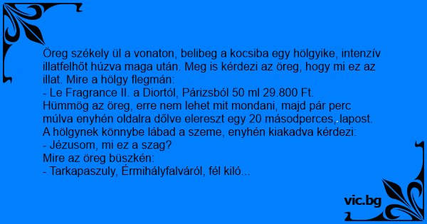 Öreg székely ül a vonaton, belibeg a kocsiba egy hölgyike, intenzív illatfelhőt húzva maga után. Meg is kérdezi az öreg, hogy mi ez az illat. Mire a hölgy flegmán: