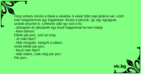 Öreg székely elindul a fiával a vásárba. A vásár több napi járásra van, ezért este megpihennek egy fogadóban. Kevés a pénzük, így egy egyágyas szobát vesznek ki. Lefekvés után így szól a fiú: