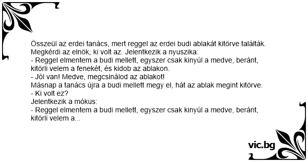 - Reggel elmentem a budi mellett, egyszer csak kinyúl a medve, beránt, kitörli velem a fenekét, és kidob az ablakon.