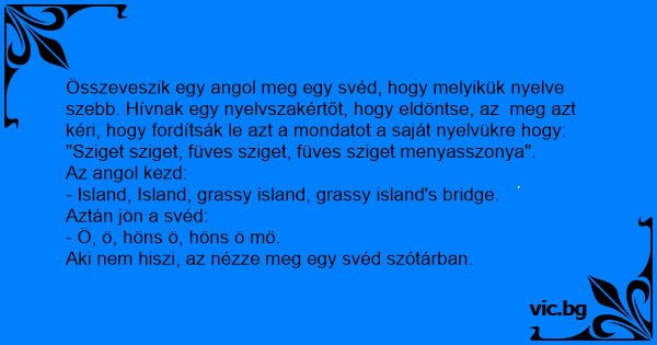 Összeveszik egy angol meg egy svéd, hogy melyikük nyelve szebb. Hívnak egy nyelvszakértőt, hogy eldöntse, az meg azt kéri, hogy fordítsák le azt a mondatot a saját nyelvükre hogy: