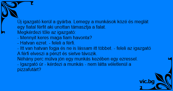 - Igazgató úr - kérdezi a munkás - nem látta véletlenül a pizzafutárt?