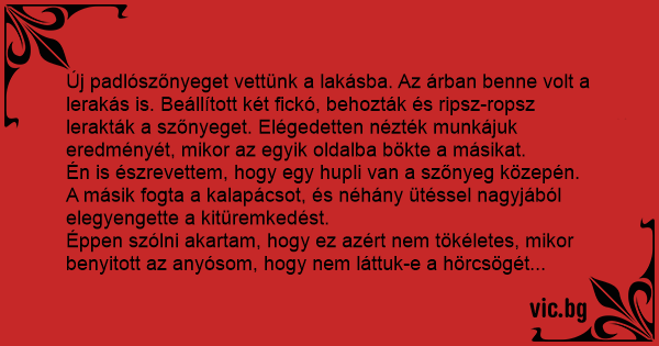 Új padlószőnyeget vettünk a lakásba. Az árban benne volt a lerakás is. Beállított két fickó, behozták és ripsz-ropsz lerakták a szőnyeget. Elégedetten nézték munkájuk eredményét, mikor az egyik oldalba bökte a másikat.