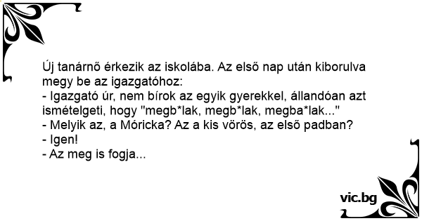 - Igazgató úr, nem bírok az egyik gyerekkel, állandóan azt ismételgeti, hogy "megb*lak, megb*lak, megba*lak..."
