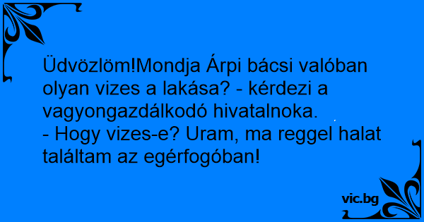 Üdvözlöm!Mondja Árpi bácsi valóban olyan vizes a lakása? - kérdezi a vagyongazdálkodó hivatalnoka.