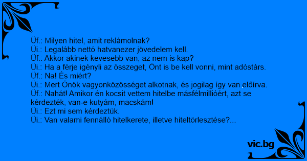 Üf.: Nahát! Amikor én kocsit vettem hitelbe másfélmillióért, azt se kérdezték, van-e kutyám, macskám!