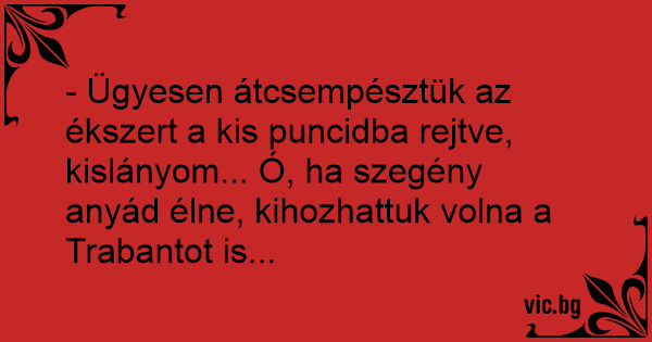 - Ügyesen átcsempésztük az ékszert a kis puncidba rejtve, kislányom... Ó, ha szegény anyád élne, kihozhattuk volna a Trabantot is...
