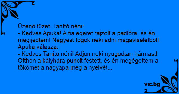 - Kedves Tanító néni! Adjon neki nyugodtan hármast! Otthon a kályhára puncit festett, és én megégettem a tökömet a nagyapa meg a nyelvét...
