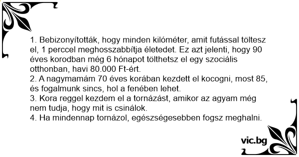 1. Bebizonyították, hogy minden kilóméter, amit futással töltesz el, 1 perccel meghosszabbítja életedet. Ez azt jelenti, hogy 90 éves korodban még 6 hónapot tölthetsz el egy szociális otthonban, havi 80.000 Ft-ért.