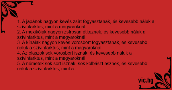 1. A japánok nagyon kevés zsírt fogyasztanak, és kevesebb náluk a szívinfarktus, mint a magyaroknál.