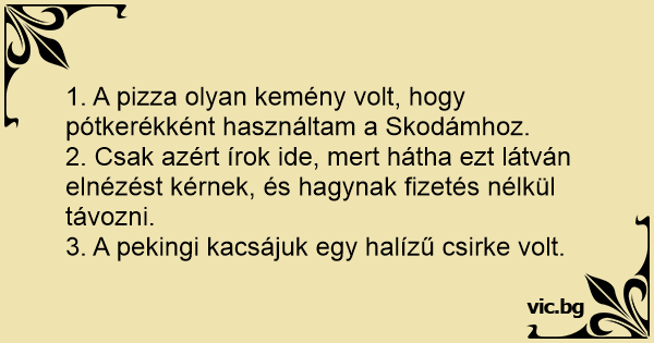 1. A pizza olyan kemény volt, hogy pótkerékként használtam a Skodámhoz.