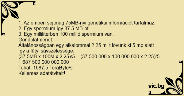 1 сперматозоид съдържа 37. 5 мегабайта ДНК информация. Това значи, че една нормална еякулация представлява трансфер от 1 587 гигабайта за 3 секунди.