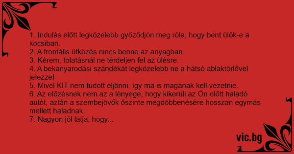 6. Az előzésnek nem az a lényege, hogy kikerüli az Ön előtt haladó autót, aztán a szembejövők őszinte megdöbbenésére hosszan egymás mellett haladnak.