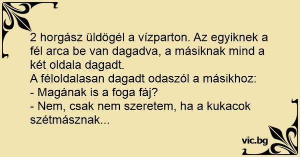 2 horgász üldögél a vízparton. Az egyiknek a fél arca be van dagadva, a másiknak mind a két oldala dagadt.