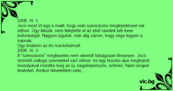Jocó most írt egy e-mailt, hogy este szenzációs meglepetéssel vár otthon. Úgy látszik, nem felejtette el az első randink két éves évfordulóját. Nagyon izgulok, már alig várom, hogy vége legyen a napnak.