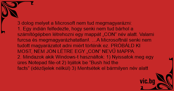 1. Egy indián felfedezte, hogy senki nem tud bárhol a számítógépben létrehozni egy mappát „СОN” név alatt. Valami furcsa és megmagyarázhatatlan!. …A Microsoftnál senki nem tudott magyarázatot adni miért történik ez. PRÓBÁLD KI MOST, NEM JÖN LÉTRE EGY „СОN” NEVŰ MAPPA.
