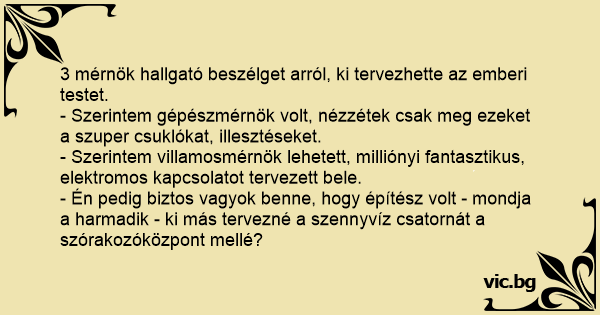- Én pedig biztos vagyok benne, hogy építész volt - mondja a harmadik - ki más tervezné a szennyvíz csatornát a szórakozóközpont mellé?