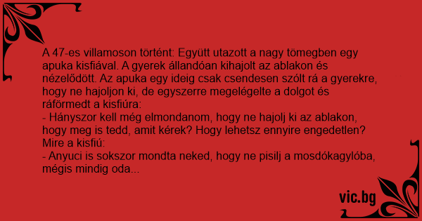 A 47-es villamoson történt: Együtt utazott a nagy tömegben egy apuka kisfiával. A gyerek állandóan kihajolt az ablakon és nézelődött. Az apuka egy ideig csak csendesen szólt rá a gyerekre, hogy ne hajoljon ki, de egyszerre megelégelte a dolgot és ráförmedt a kisfiúra: