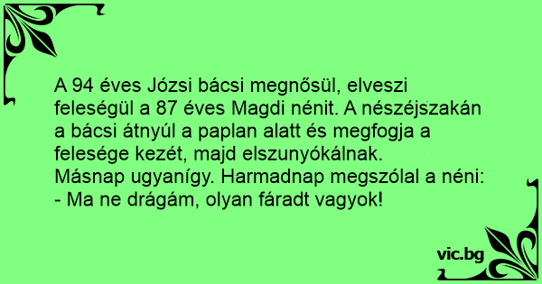 A 94 éves Józsi bácsi megnősül, elveszi feleségül a 87 éves Magdi nénit. A nészéjszakán a bácsi átnyúl a paplan alatt és megfogja a felesége kezét, majd elszunyókálnak.
