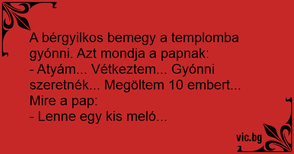 A bérgyilkos bemegy a templomba gyónni. Azt mondja a papnak:<br />- Atyám... Vétkeztem... Gyónni szeretnék... Megöltem 10 embert...<br />Mire a pap:<br />- Lenne egy kis meló...