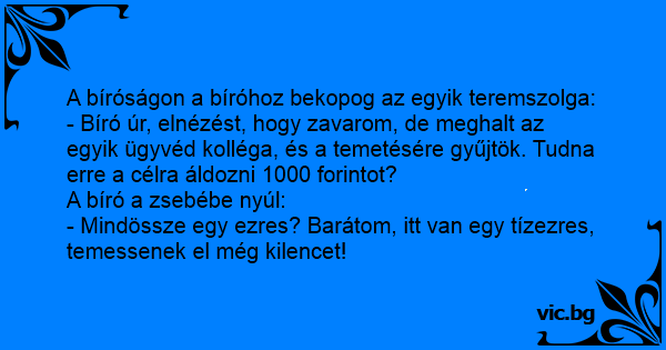 - Bíró úr, elnézést, hogy zavarom, de meghalt az egyik ügyvéd kolléga, és a temetésére gyűjtök. Tudna erre a célra áldozni 1000 forintot?