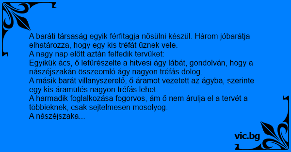 A másik barát villanyszerelő, ő áramot vezetett az ágyba, szerinte egy kis áramütés nagyon tréfás lehet.