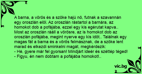 A barna, a vörös és a szőke hajú nő, futnak a szavannán egy oroszlán elől. Az oroszlán rástartol a barnára, az homokot dob a pofájába, ezzel egy kis egérutat kapva.. Most az oroszlán rááll a vörösre, az is homokot dob az oroszlán pofájába, megint nyerve egy kis időt.. Találnak egy magas fát a barna és a vörös felmásznak, de a szőke lent marad és elkezdi sminkelni magát, megkérdezik: