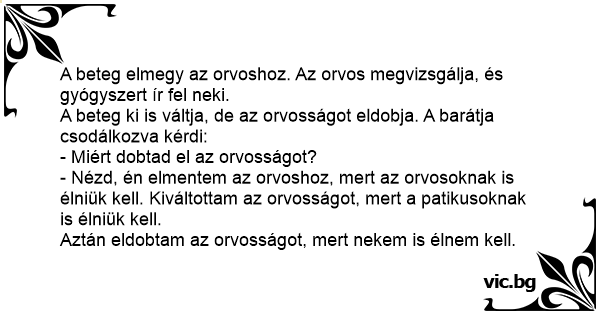 - Nézd, én elmentem az orvoshoz, mert az orvosoknak is élniük kell. Kiváltottam az orvosságot, mert a patikusoknak is élniük kell.