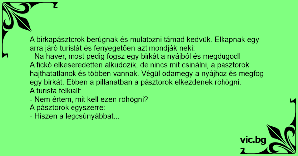 A birkapásztorok berúgnak és mulatozni támad kedvük. Elkapnak egy arra járó turistát és fenyegetően azt mondják neki: